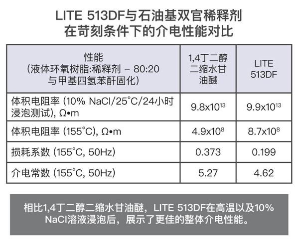 根據(jù)IEC 62631和IEC 60243標(biāo)準(zhǔn)進(jìn)行測試,如其介電性能所示,LITE 513DF提供了良好的絕緣性能。在Epon 828的配方中,樹脂的使用量為20%,用MTHPA(甲基四氫鄰二甲酸酐)固化,并用BDMA(芐基二甲胺)催化。LITE 513DF展示了優(yōu)異的結(jié)果,其體積電阻率和介電強(qiáng)度更高,損耗因數(shù)和介電常數(shù)比競品1,4丁二醇二縮水甘油醚更低。當(dāng)兩種稀釋環(huán)氧樹脂體系都暴露于高溫或鹽溶液中時,LITE 513DF的性能優(yōu)于石油基雙官能稀釋劑。LITE 513DF是一款良好的環(huán)氧稀釋劑和改性劑,適用于電氣灌封、鑄造和封裝(浸漬樹脂)。
