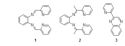 鄰二胺與2-吡啶甲醛反應(yīng)時(shí)得到的是N4席夫堿配體1[1],但是當(dāng)把2-吡啶甲醛換成2-乙?;拎r(shí),以氯甲酸甲酯為催化劑,在異丙醇中反應(yīng)沒有得到相應(yīng)的N4席夫堿配體2,而是得到了并六元環(huán)產(chǎn)物即2-(2′-吡啶基)喹喔啉3[2]。